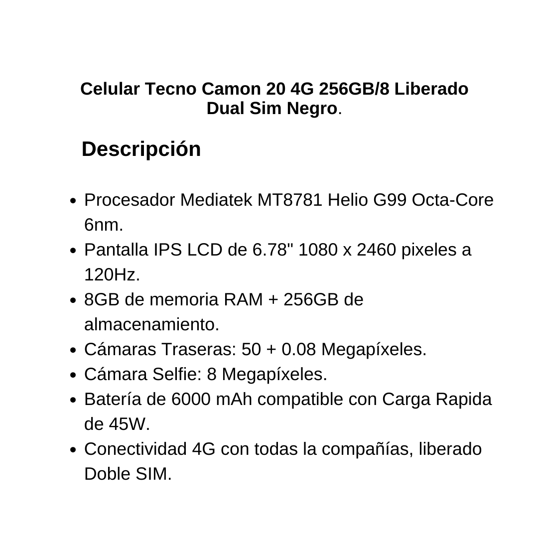 Celular Tecno Camon 20 4G 256GB/8 Liberado Dual Sim Negro